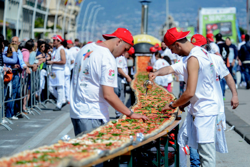 Sono stati prodotti 100 mt di pizza margherita tipica della tradizione partenopea e 400 metri di pizza con ricette ed ingredienti delle 20 regioni: sarda con Bottarga, valdostana con Fontina e Lard d’Arnad, trentina con Speck, siciliana con Pachino e Tonno, friulana con formaggio Montasio e ancora, pugliese con Cipolla di Acquaviva e Burrata, emiliana con Mortadella, calabrese con Nduja e poi veneta con Radicchio e molisana con caciocavallo di Agnone. Molti di questi ingredienti sono stati resi disponibili grazie alla preziosa collaborazione dei rinomati brand D’Amico e Robo.